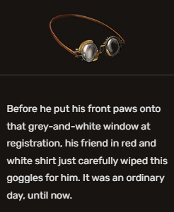 PERSONAL ITEM:His goggles. He wears them around his neck, and they seem to be a sentimental thing relating to his master. No function that is known.